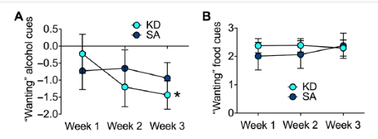 為了驗證上述想法,研究團隊讓23名剛?cè)朐航邮苤委煹男锞普哌M行生酮飲食,并將另外23名酗酒者作為對照組。為了評估生酮飲食對他們的影響,研究人員每周測量一次參與者的酮體和乙酸鹽水平。