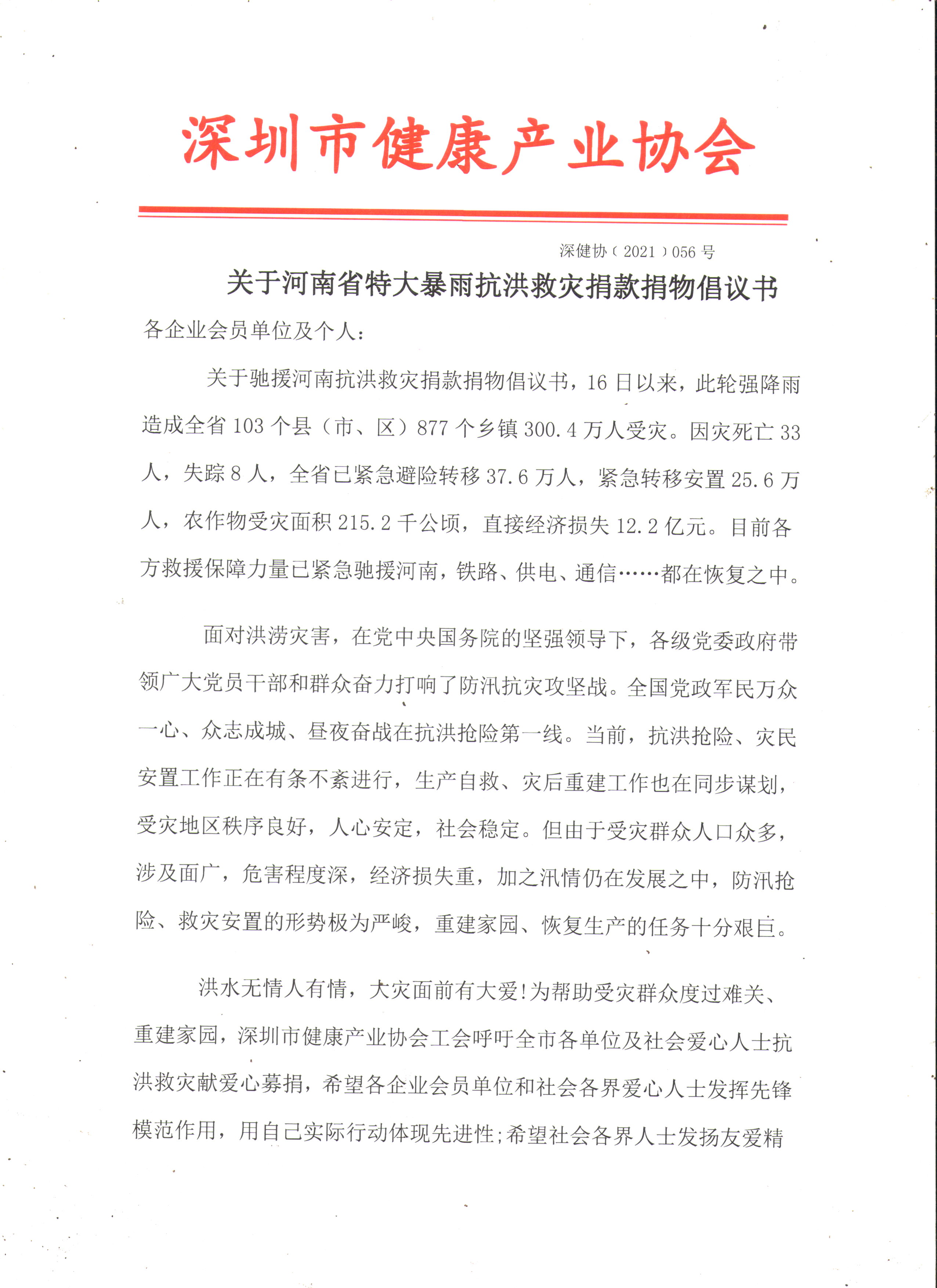 洪水無情人有情,大災(zāi)面前有大愛!為幫助受災(zāi)群眾度過難關(guān)、重建家園,深圳市健康產(chǎn)業(yè)協(xié)會(huì)工會(huì)呼吁全市各單位及社會(huì)愛心人士抗洪救災(zāi)獻(xiàn)愛心募捐,希望各企業(yè)會(huì)員單位和社會(huì)各界愛心人士發(fā)揮先鋒模范作用,用自己實(shí)際行動(dòng)體現(xiàn)先進(jìn)性;希望社會(huì)各界人士發(fā)揚(yáng)友愛精神,用愛心善舉彰顯社會(huì)責(zé)任感,與災(zāi)區(qū)群眾風(fēng)雨同舟,為受災(zāi)群眾獻(xiàn)上愛心!
